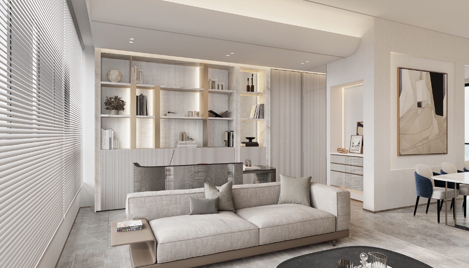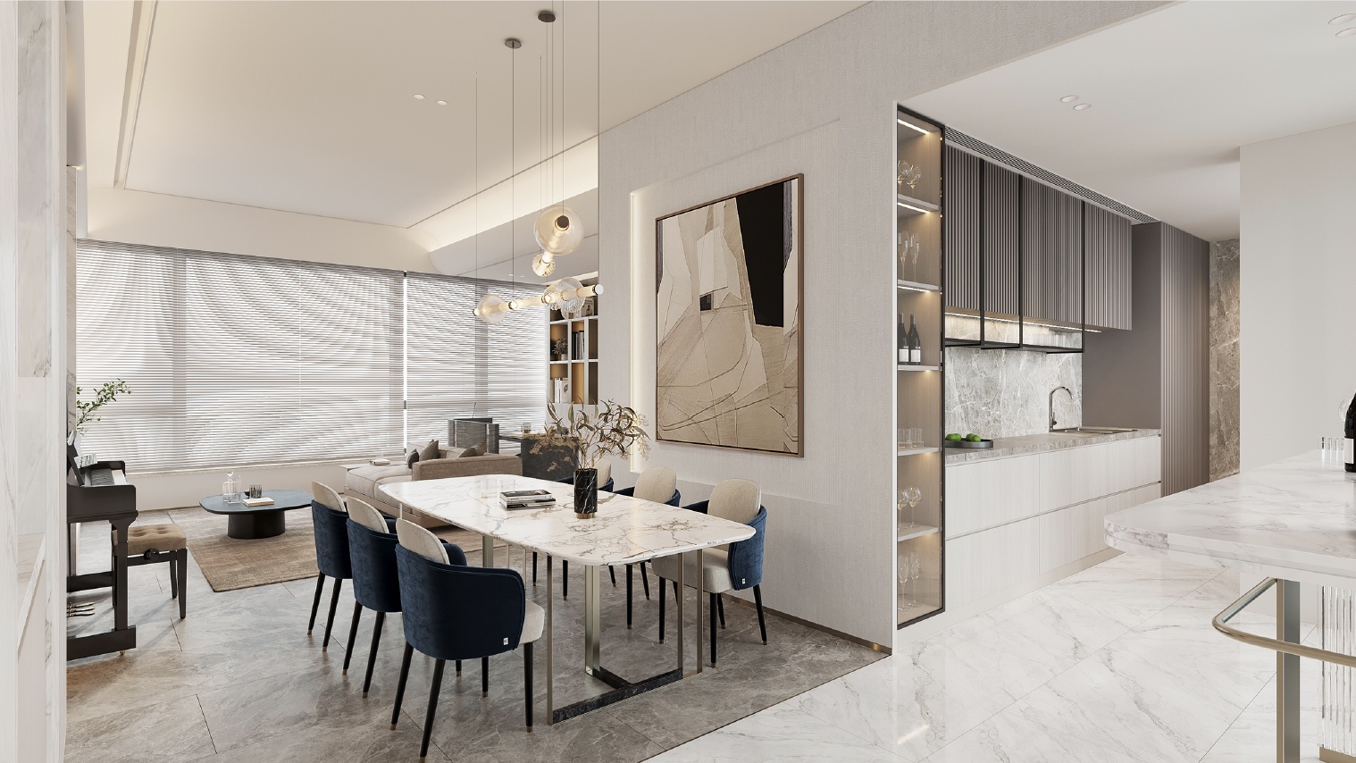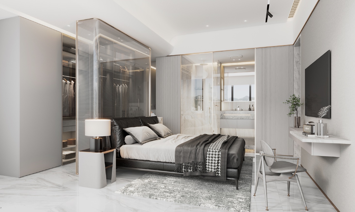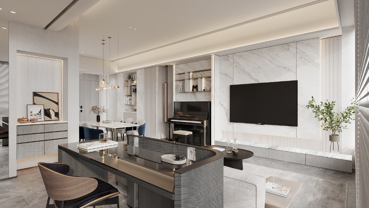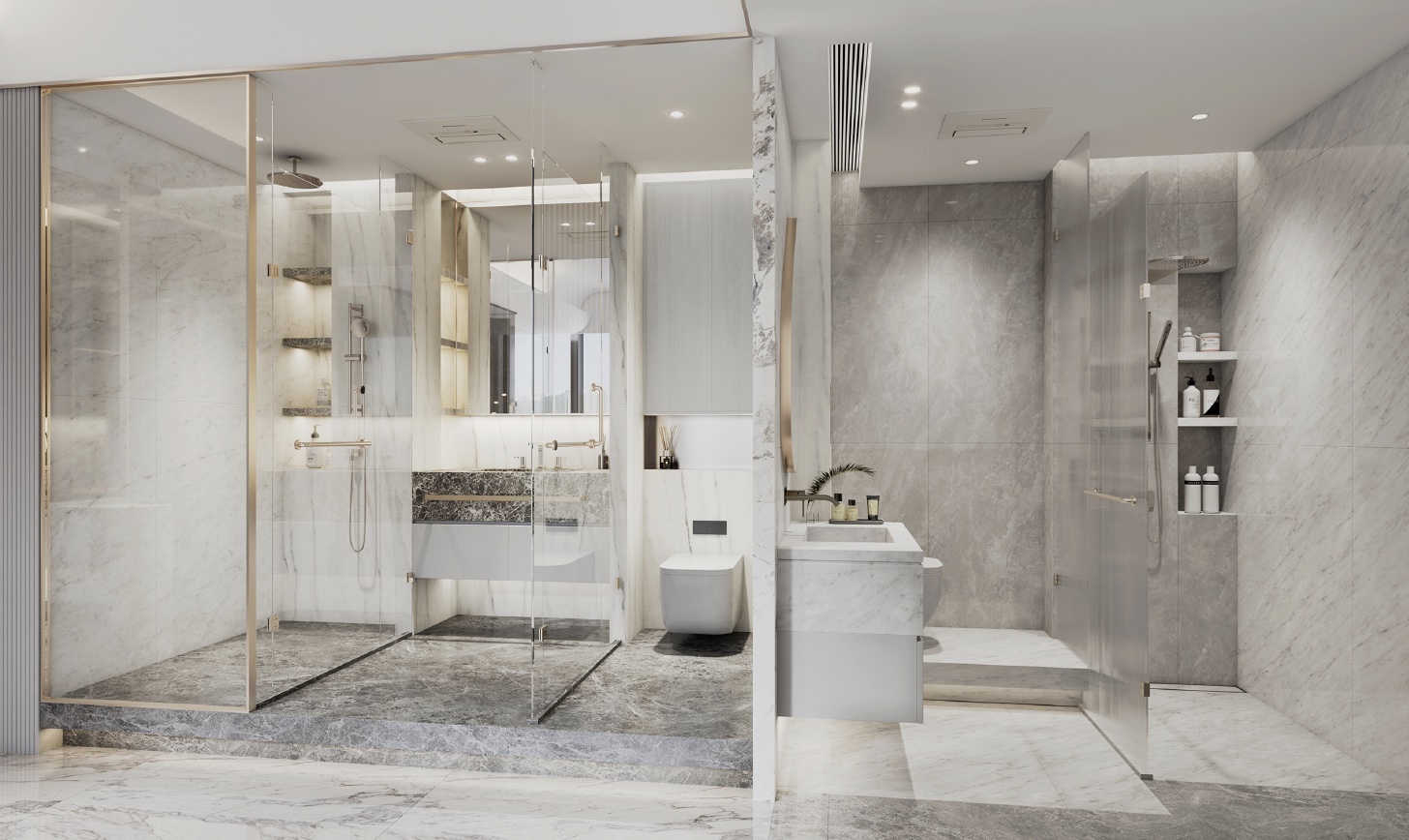The color palette of this 1,051 square feet flat at Larvotto is composed of shades of grey, white, and gold, creating a sophisticated and elegant ambiance. The open-concept interior design enhances the sense of spaciousness throughout the entire unit, allowing for a seamless flow and a feeling of expansiveness.